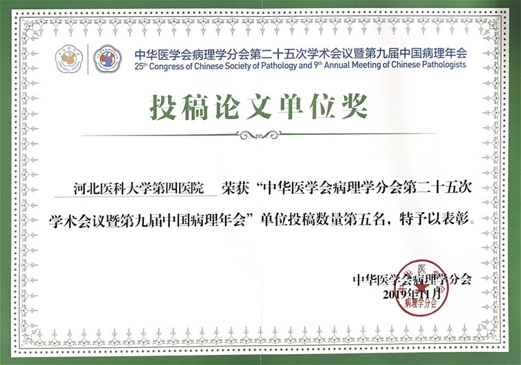 11月14至17日,中華醫學會病理學分會第二十五次學術會議暨第九屆中國病理年會在河南省鄭州市舉行。我院病理科及細胞學室投稿共131篇,居全國第五名。大會發言7人次,壁報交流34篇,書面交流91篇,其中3篇壁報被評為“優秀壁報”。我院被大會授予“投稿論文單位獎”,在論文投稿的質和量上得到了國內同行的一致贊譽,為我院在全國病理年會上贏得了榮譽。