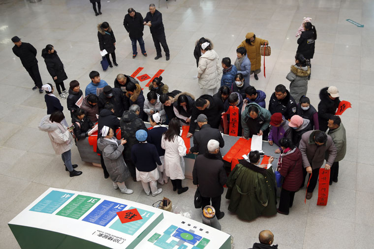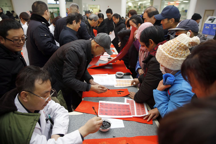 兩個院區的活動開始后不久便吸引了大量來院患者及家屬的目光,書法創作者們被層層圍住,好不熱鬧。“現在可以免費領春聯,快來”,一位大爺趕忙把這一消息告訴老伴兒。書畫協會的學員們提前打印好春聯集供每一位朋友選擇,大多家屬選擇了象征平安、健康、幸福的語句,表達了對新年的期望和祝愿。