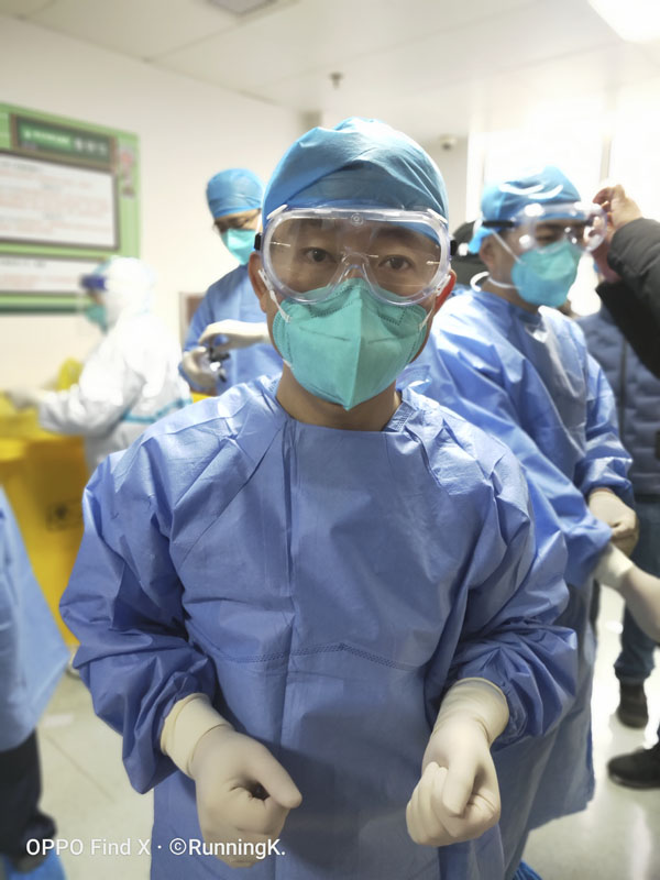 我們的醫生、護士已基本熟練日常工作,對于防護工作,我們一直進行著嚴格的培訓,大家相互檢查、糾正、督促。重癥醫學科的病人情況較重,呼吸機、監護措施都要到位。穿防護服進行工作和平日里的工作并不相同,會受到很多限制,人力、物力也都會增加。但是大家不叫苦、不叫累,努力適應這里的一切。