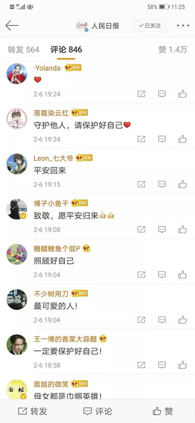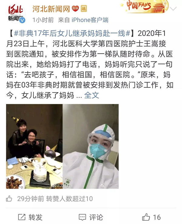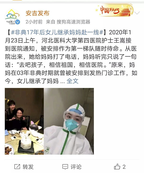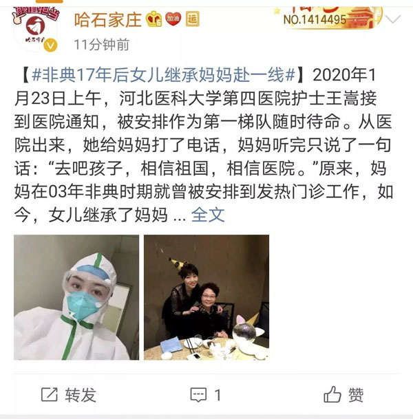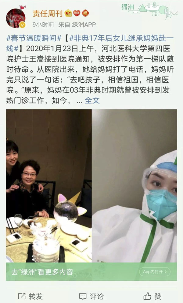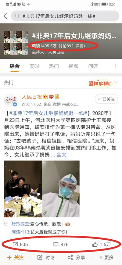 2月4日,我院官方微信訂閱號推出《我和媽媽的發熱門診……》一文后,受到眾多媒體廣泛關注。2月6日下午5點52分,人民日報官方微博號對文中內容進行發布并申請了微博超話,受到廣大網友強烈反響,截止2月7日下午3點50分,閱讀次數超過1400萬,討論次數890次,推文點贊1.5萬人次,評論876個。