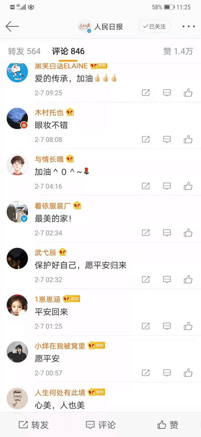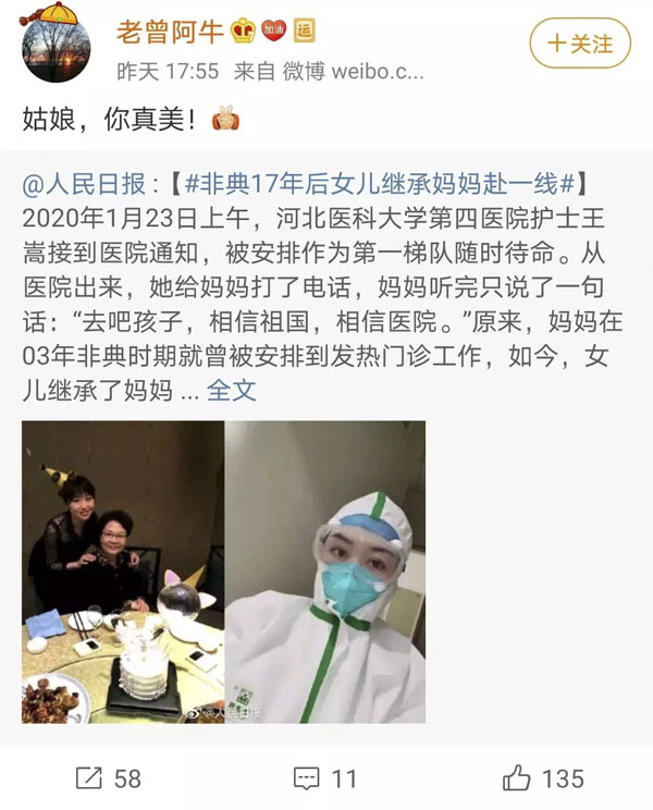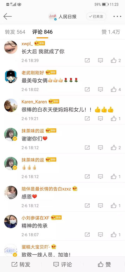 廣大網友紛紛表達了對這對母女的贊美、敬佩與祝愿。“精神的傳承”、“最可愛的人”、“平安回來”、“必勝”……