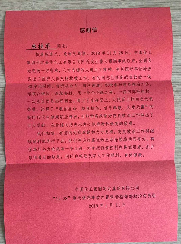 每當省內有重大搶救時,現場也總是少不了他的身影。2016年,河北省重癥H7N9患者死亡率居高不下,省衛健委抽調他先后奔赴衡水、承德和保定指導并參與H7N9甲流病人的救治,挽救了大量重癥患者的生命。2017年,張家口“7.21”重大車禍發生,他親臨現場,指導并參與了重癥傷員搶救。2018年張家口“11.28”重大爆炸事故發生后,在省衛健委的安排調度下,朱桂軍同志第一時間加入救治傷員團隊,深入一線進行了為期長達30天的救治工作,為及時有效搶救傷員發揮了重要作用,救治傷員組臨時黨委對朱桂軍同志做出了如下評價:靠得住、沖得上、打得贏,不負重托、不辱使命。