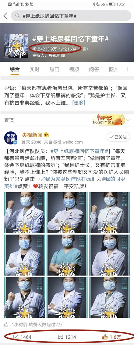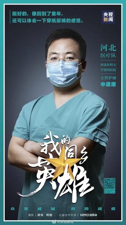 3月3日晚上20點46分,央視新聞官方微博號以我院重癥醫學科副護士長申康康接受采訪時說的“挺好的,像回到了童年,還可以體會一下穿紙尿褲的感覺”形成微博超話:#穿上紙尿褲回憶下童年#,瞬間引起強烈反響。