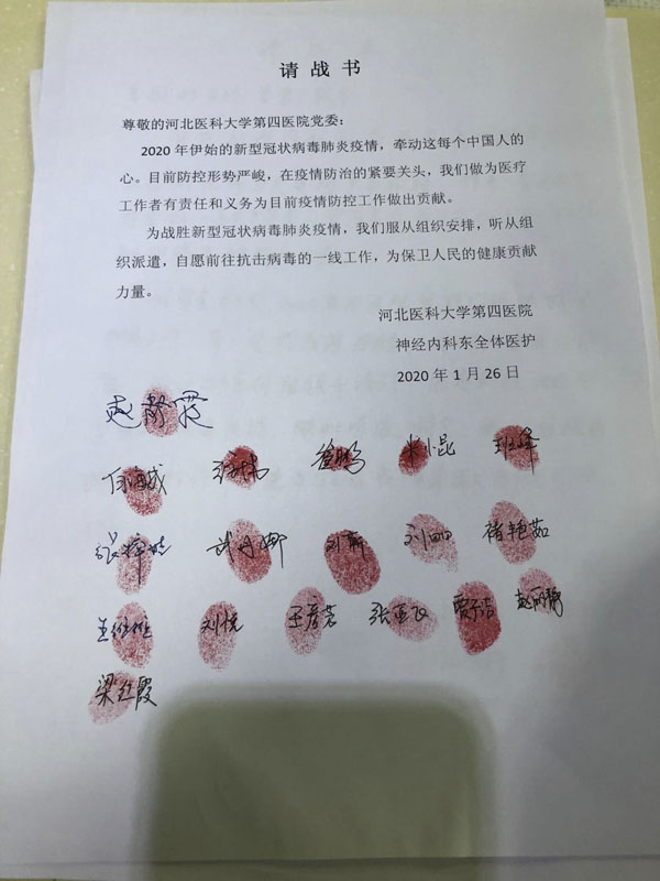 隨著疫情形勢愈發嚴峻,河北省衛健委要組建醫療團隊前去馳援武漢。接到通知后,科室全體醫護人員主動請纓,他們在請戰書上莊嚴地簽上了自己的名字并按下紅手印,要求到一線去做貢獻。按滿紅手印的請戰書熠熠生輝,全科人員隨時處于待命狀態。