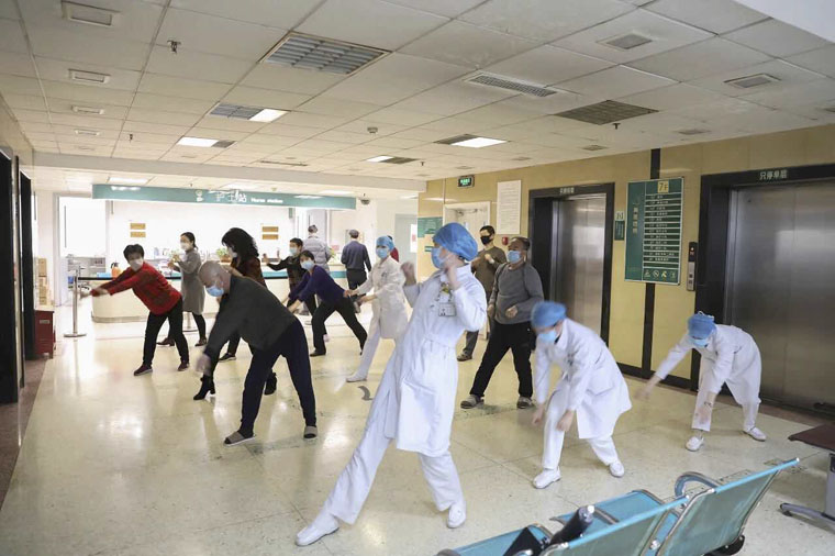近日,傍晚的放一科病房格外“熱鬧”。“1,2,3,4……”,患者和家屬朋友們列好隊形,跟著節拍,集體舞動,氣氛愉悅。自3月18日開始,每天晚上7點,由中班護士組織并帶領患者及家屬在病房中廳跟隨視頻做醫療保健操,受到大家熱烈歡迎。