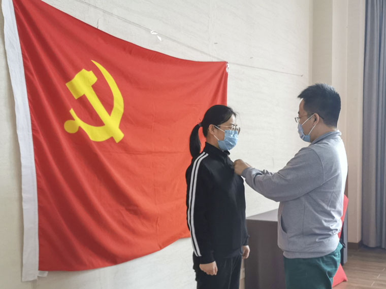 我院援鄂抗疫醫療隊臨時黨支部書記申康康同志為王亞美同志佩戴黨徽