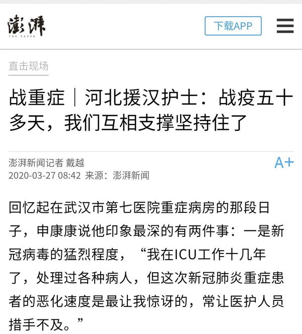 “ICU里的護士和普通病房里的護士完全不是一個概念,在新冠肺炎ICU做護士更辛苦忙碌。”申康康如是告訴澎湃新聞。