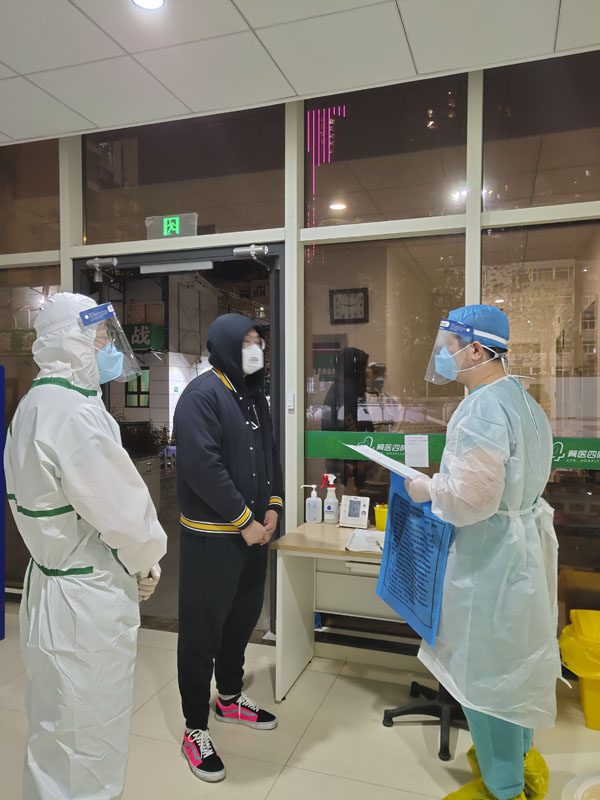 在隔離病房,患者身邊沒有親人,容易產生孤獨恐懼心理,醫護人員除了為患者做好咽拭子采集,輸液治療及生活幫助外,還要更多關注患者心理變化并及時溝通給予安慰,緩解其緊張情緒。有一位發熱患者是哺乳期的媽媽,在得知自己要被隔離留觀時顯得很無措。醫生一遍又一遍地為其耐心講解病情及留觀的必要性,解除其顧慮直到患者配合治療。有一位17歲的高三學生在留觀后擔心網課沒法上,護士們趕緊找到了插線板,幫助他連接發熱診區的WiFi,就這樣把網課搬進了隔離病房,一邊輸液一邊上課。還有一位年輕的患者半夜突然胃不舒服,沒來得及去衛生間就吐在病房了,護士們趕緊跑來清理,她站在床旁一臉歉疚,護士們連連安慰她,她如釋重負地說道:“給你們添麻煩了,謝謝……”