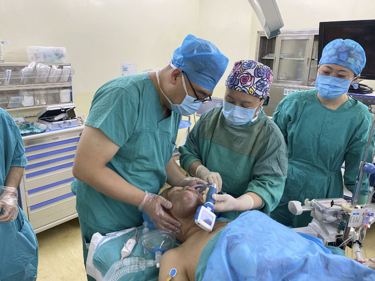 在賈慧群教授的指導下,給5L/min面罩吸氧去氮,以提高其缺氧耐受程度,同時進行輕度鎮靜。在充分表面麻醉后,采用可視喉鏡經口探查了解口腔結構,但因腫瘤巨大而失敗,這預示著插管更加撲朔迷離。此時,專家們果斷按照預先方案開始經鼻插管,順利進入鼻腔后,通過纖維支氣管鏡探查口腔結構,發現解剖結構混亂。賈慧群教授、李超主任沉著應戰,憑借嫻熟的技術,在纖支鏡引導下,慢慢將氣管導管通過舌體和狹小的咽喉腔,經過多次探查,最終找到聲門并成功置入了氣管插管。之后,他們快速推注全麻藥物,患者安然入睡,手術順利開始。