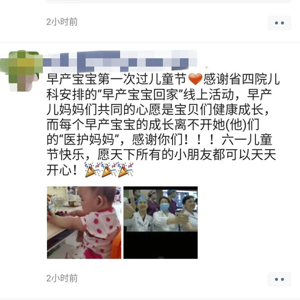 自2017年起,每到六一兒童節,兒科都會邀請曾經在NICU“畢業”的寶寶們“回家”過節,已經持續3年。今年受疫情影響,寶寶們通過“云”回家,體驗別樣的快樂。兒科新生兒重癥監護室(NICU)長期致力于危重新生兒的防治及早產兒的全方位綜合管理,在提高早產兒搶救成功率的同時,非常關注他們的遠期健康,為孩子們的健康成長不懈奮斗。