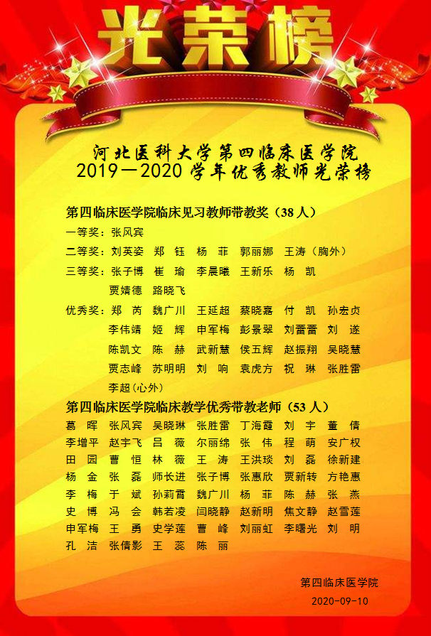 在第36個教師節到來之際,我院對2019-2020學年優秀教師進行了表彰,評選出第四臨床醫學院臨床見習教師帶教獎38人,第四臨床醫學院臨床教學優秀帶教教師53人,以此向默默耕耘在臨床教學一線的職工致以節日的祝賀和崇高的敬意。