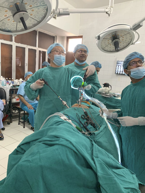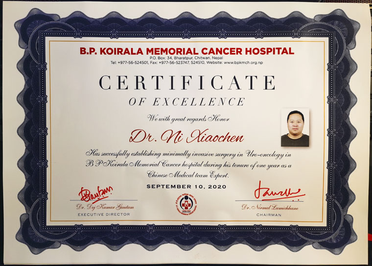 2019年3月,倪曉辰副主任代表我院參加第12批中國援尼泊爾醫療隊,抵達萬里之遙的尼泊爾B.P柯依拉臘紀念腫瘤醫院執行援外任務。受援醫院位于尼泊爾中部奇達旺地區,經濟落后、交通不便、生活條件差,雖然該院是尼泊爾最大和最有影響力的腫瘤醫院,但受限于國情且醫療水平與國內有很大差距。倪曉辰與尼爾曼院長(兼泌尿外科主任)積極深入交流,克服多種困難,竭盡所能地先后開展了腹腔鏡腎部分切除術、腹腔鏡膀胱根治性切除術、腹腔鏡前列腺癌根治術等多種高難度手術術式,填補了該院空白,并對該院醫生進行規范化手術培訓,培養了一支帶不走的醫療隊。