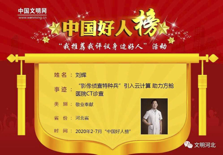 26個日夜,624個小時,劉輝臨危受命,帶領由31名河北兄弟姐妹組成的影像技術“特戰隊”奮戰在武漢的3家方艙醫院,累計完成CT掃描2139人次,日均掃描200人次以上,為新冠肺炎患者快速接受精準的診療與救治保駕護航。他編寫了全國首份方艙醫院影像檢查防控與質控手冊,用云計算改變了方艙醫院CT檢查流程,讓工作流程更規范,讓醫生診斷更方便,他不辭辛苦貢獻智慧力量,被譽為“值得信賴且常常帶來驚喜的人”。