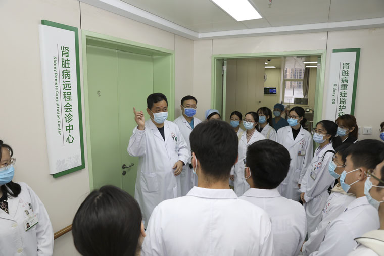 徐金升教授帶領學生們參觀腎內科病區,醫護老師們熱情地接待了這些“好奇寶寶”,為他們介紹了腎內科的科室建設、腎病學的學科特點,還詳細地講解了腎內科科徽和“崇德尚道、謹修慎行”的科訓,引導學生在病區內近距離觀察醫生的工作過程,加深同學們對未來職業的認識和體會。腎臟病重癥監護病房、腎臟病實驗室、血液透析中心、慢性腎病管理中心等是教科書中的“未知領域”,這種“神秘感”增強了學生們對于知識的興趣與熱情。參觀結束后,徐金升教授對同學們提出希望,要建立以疾病為導向、由案例入手的學習模式,保持孜孜不倦的學習狀態,在增加專業知識儲備的同時不要忘記融入對醫學人文的探討,努力提高自己的人文修養。愿大家回首今日,以夢為馬,不負韶華。”