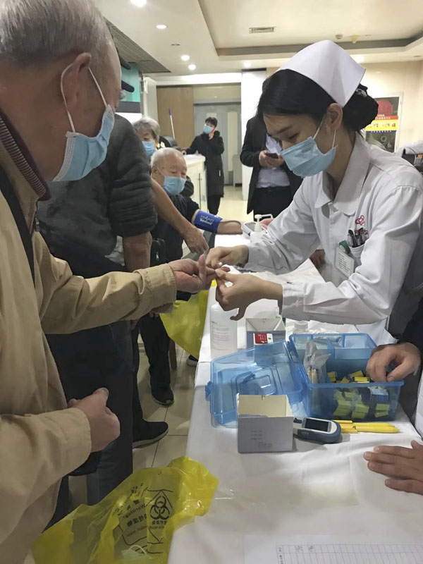在東院,內分泌科病區主任王原教授和張玉娜副教授帶領護士于門診大廳為150余名患者及家屬免費測量血壓、監測血糖。專家們認真詢問患者及群眾的病史,耐心解答糖尿病患者的提問,對他們進行初步篩查,給予合理的用藥建議。醫護人員對百姓關注的糖尿病飲食運動及用藥方面的問題進行宣講,發放了宣傳手冊和問卷。通過統計問卷發現,受試者對糖尿病及其并發癥防治方面的知識儲備不足,下一步科室將針對糖尿病教育舉辦更多特色活動。