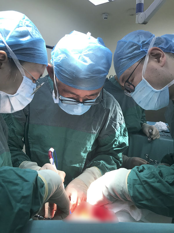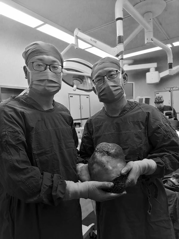 手術當日,由齊義新主任醫師主刀、史佳杰主治醫師擔任一助。患者左乳腫瘤負荷大,皮瓣菲薄,在手術過程中發現腫瘤的血供極其豐富,血管迂曲擴張如蚯蚓狀,手術比預想的還要困難,整個過程舉步維艱,僅結扎血管就有近70余處。經過近2個小時的耐心分離解剖,他們順利將左側乳房完整從胸肌上剝離,且腫瘤完整無損。手術歷時3小時,近20斤的腫瘤被完整切除。齊義新主任醫師、史佳杰主治醫師嚴密細致地沖洗、止血后放置胸壁引流管并縫合手術切口,術中患者生命體征平穩,出血量約100ml,麻醉清醒后順利返回病房,術后恢復良好,順利出院。