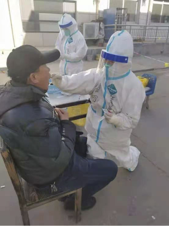 在零下17度的環境下進行戶外采集核酸,非常艱辛,兩位隊員為剛脫下隔離衣的小伙伴搓手取暖。