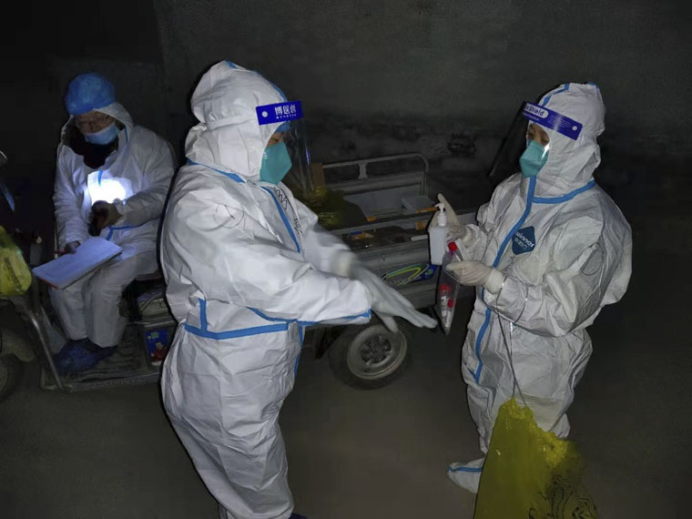 凌晨2點,四院白衣天使依舊執行采集核酸任務,這是入戶前的手消工作,這一動作他們在寒風中重復了無數次。