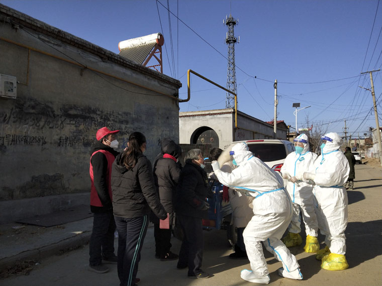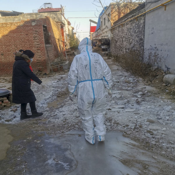 由于村莊里氣溫特別低,地上有點水就立馬結成冰,穿著隔離衣和鞋套挨家挨戶去入戶采集的時候,走在上邊就特別容易摔跟頭,但是隊員們還是克服困難,保證每個人都采集到。