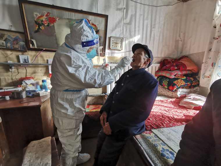 和村里工作人員溝通好后,隊員們立即有序組織開展核酸采集工作。有特殊情況的包括癱瘓的、身體不好的和老人小孩兒,隊員們會跟隨村民挨家挨戶的入戶采集,保證不落下一人。