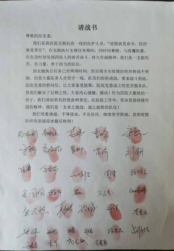 在黨員先鋒模范作用的感召下,無極核酸采集隊已有20多名隊員遞交了入黨申請書。在他們執行任務的第15天,全體隊員集體簽下請戰書,要求繼續堅守陣地,戰斗到底,直到迎來最后的勝利。