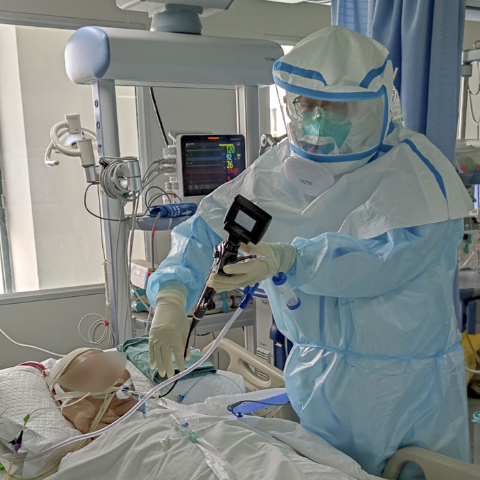 病區里有多名重癥患者,每天都要完成氣管鏡檢查,以觀察氣道粘膜并收集氣道分泌物。檢查過程中,患者氣道開放會產生大量飛沫或氣溶膠,具有極高的感染風險,對操作者的心理和技術要求都很高。為了保障安全,操作前需要在常規防護服外穿戴隔離衣和防護頭罩,這讓原本就不順暢地呼吸變得更加艱難,每一個動作都變得吃力了許多,原本正常狀態下幾分鐘就能結束的操作,現在都需要二十分鐘以上才能完成。面對這種復雜情況,我率先行動、迎難而上,不僅因為我是一名有著10多年氣管鏡操作經驗的醫生,更因為我是一名有著20多年黨齡的老黨員。