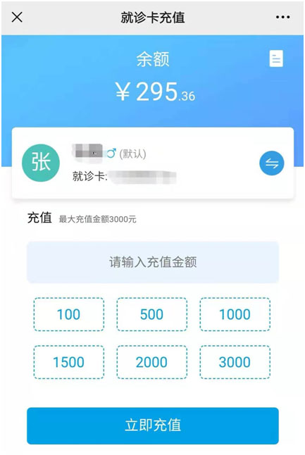 在“就診卡充值”界面,顯示就診人姓名和就診卡號,表示就診卡與微信公眾號已綁定。