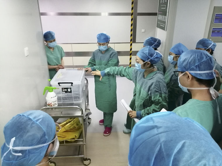 為抗擊新冠肺炎疫情,在醫院黨委的正確領導下,東院手術室迅速調整工作重心,時刻做好應對疫情準備。根據有關“新冠肺炎疫情醫療救治工作方案”的要求,東院手術室設立緩沖手術間,備好防護用品及終末消毒物品,在疫情期間呈常態化備用狀態,并培訓所有護士《緩沖手術間管理要求》,明確緩沖手術間收治病人范圍,為接診待除外新冠病毒感染的緊急手術做好準備。經護理部指導,科室多次安排了“待除外新冠病毒感染患者急診手術的應急演練”,全員參與,集思廣益,就手術過程中可能出現的各種問題進行討論,隨時準備迎接疫情的挑戰。