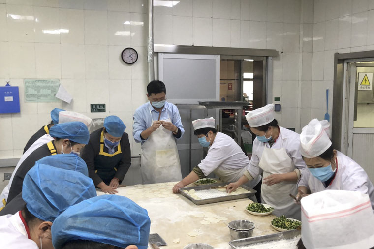 東院膳食部廚師長李福震與大家熱火朝天地準備菜肴,他說:這是我除夕夜堅守崗位的第27年,非常有意義,希望石家莊早日徹底戰勝疫情!