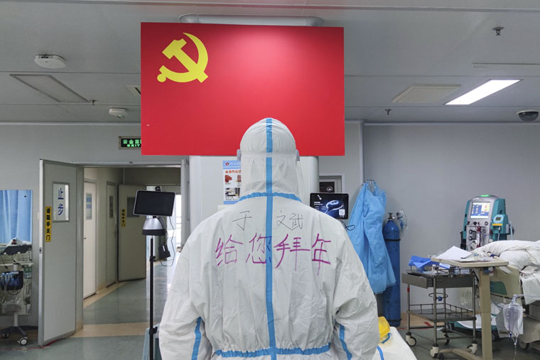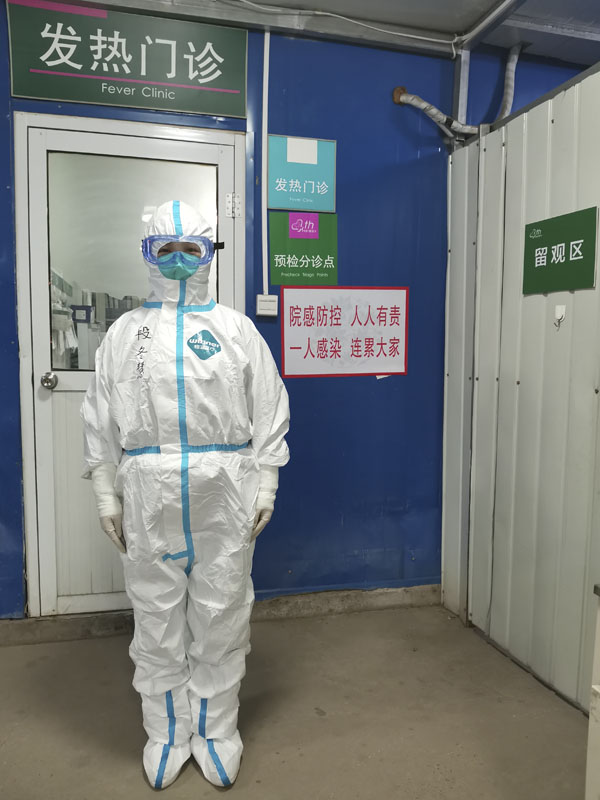 急診科于斌在省胸科醫院堅守工作崗位,在防護服上寫下“給您拜年”。