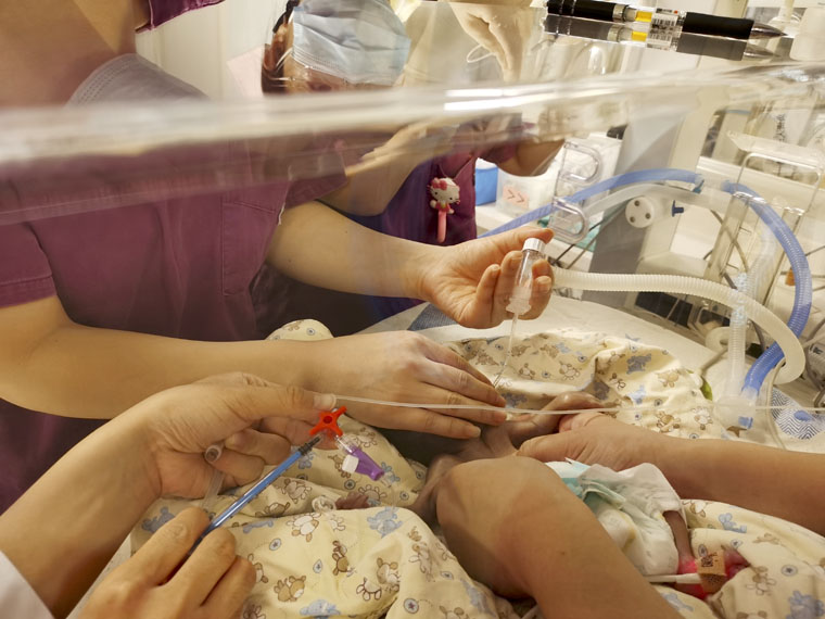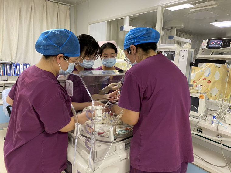 在東院區的新生兒室,醫務工作者正在積極搶救一例25周的早產兒。
