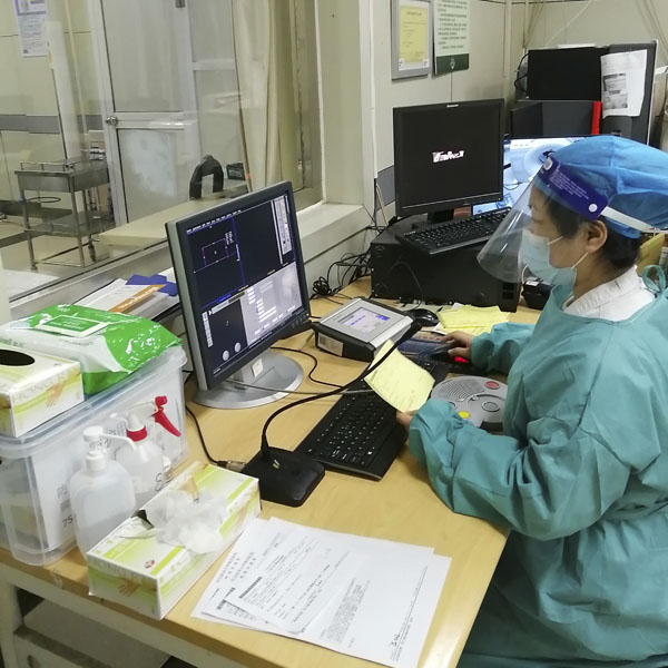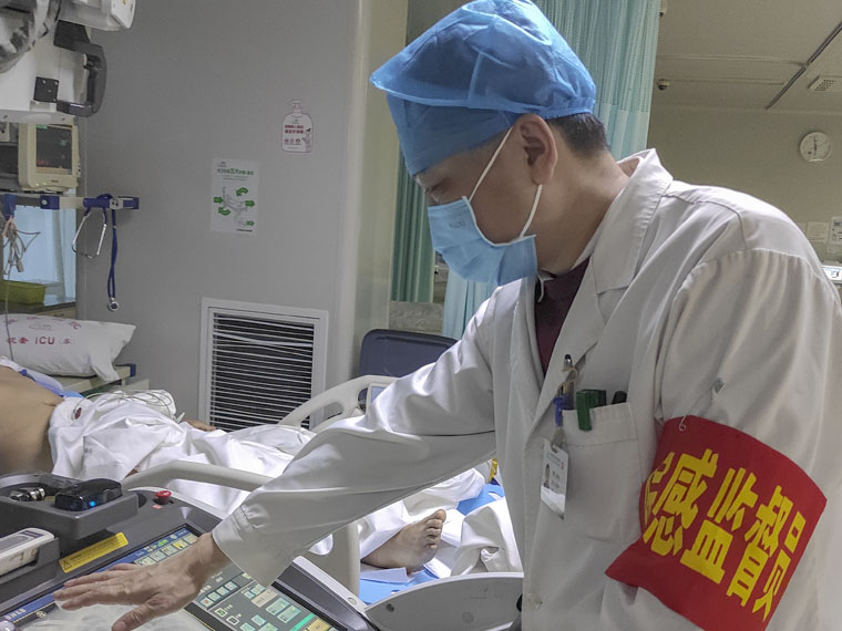 放射科殷風華在東院ICU病區進行床旁檢查。