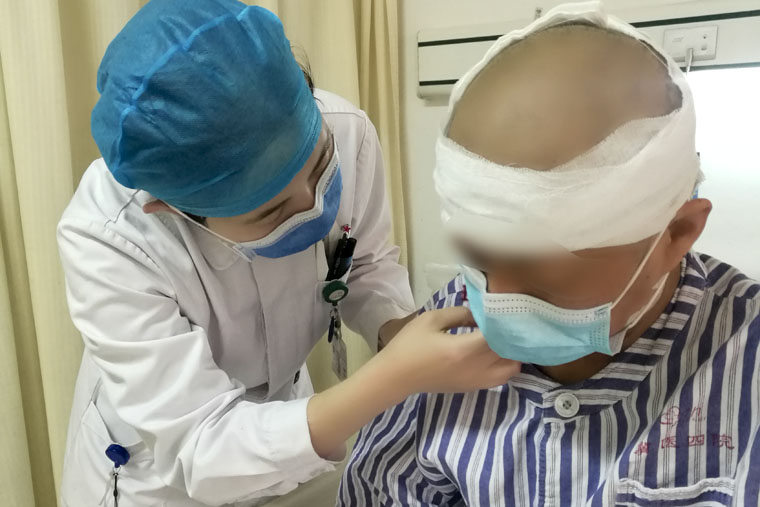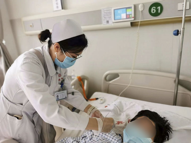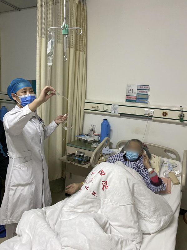 婦科二病區的楊倩為患者維護中心靜脈導管。
