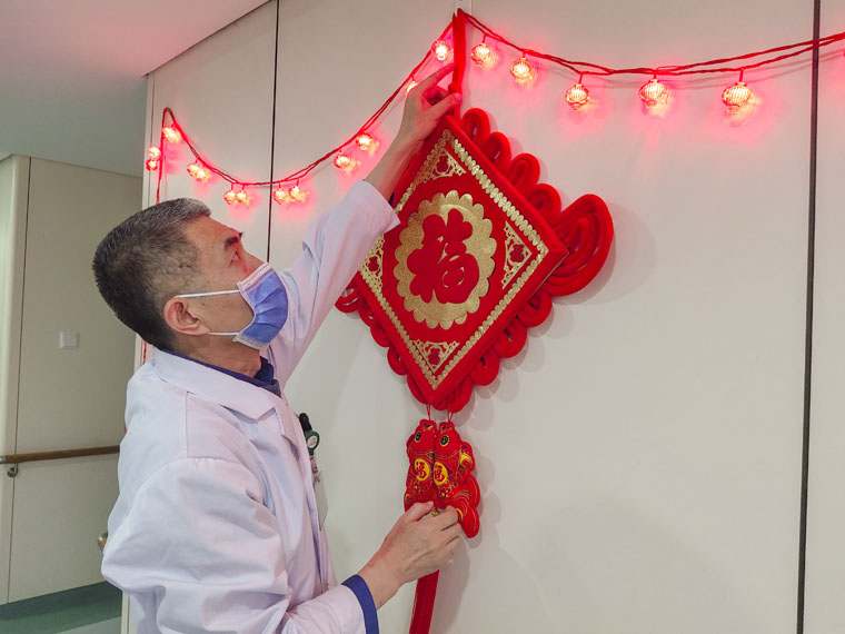 除夕當日,胸六科姚繼方在科室掛“福”,把科室精心“裝扮”。