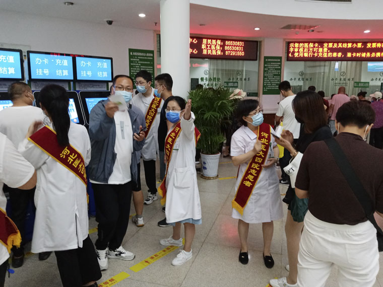 第49黨支部于6月30日組織12名正式黨員、預備黨員、入黨積極分子,在東院門診大廳開展了以義務導醫為主要內容的主題黨日活動。大家身披“河北醫大四院志愿者”的綬帶,胸前佩戴黨徽,到東院門診樓一樓大廳開展為患者指引科室方位,協助辦理就診卡、掛號、交費、打印檢查化驗報告和發票等內容的導醫志愿服務。第50黨支部組織東院門診部黨員向患者和家屬提供了熱情、周到的此類導醫服務。
