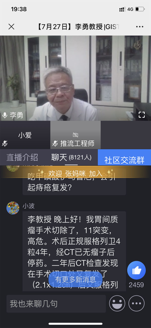 李勇教授對手術治療、靶向藥物治療過程中的注意事項進行了詳細介紹并就靶向藥物治療隨訪復查的重要性及隨訪復查的間隔及方法進行了講解。他全面詳細地詮釋了GIST全程管理,在主題講解結束后,李勇教授就 “GIST是否需要進行基因檢測、術后是否需要服用靶向藥物、服用靶向藥物需持續幾年”等患者關心的問題進行了在線答疑。