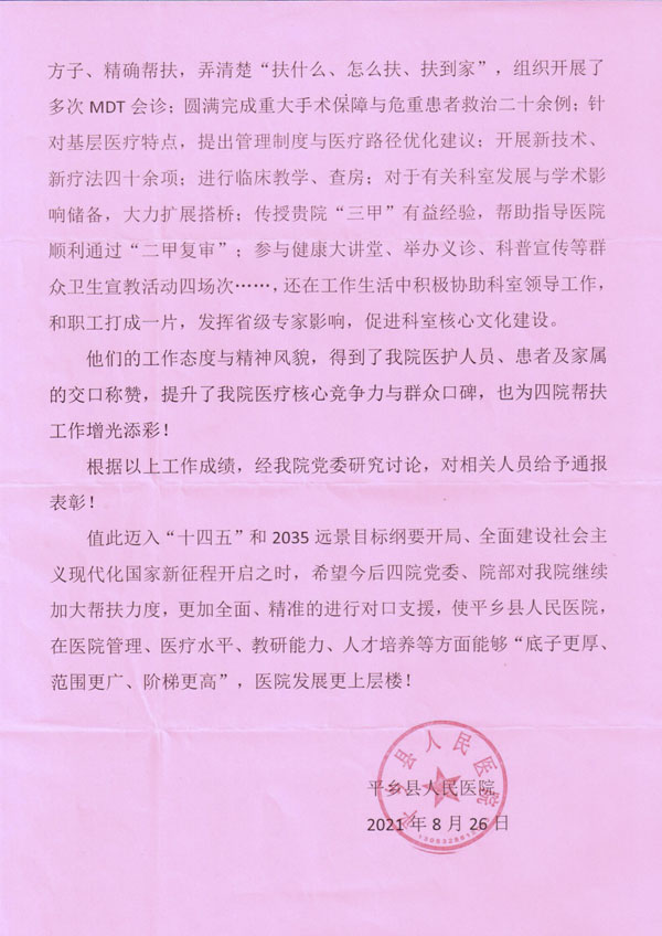 平鄉縣與我院的情誼結于2005年,是我院最早的基層幫扶單位之一。多年來,我院派駐的醫務人員從少到多、從短期到長期,至今已近百人,基本涵蓋了全部醫療學科。為感謝我院對當地一直以來的傾心幫扶與突出的成績,平鄉縣人民醫院對上述幫扶隊員進行通報表揚,授予了集體與個人的幫扶先進榮譽稱號,并給我院送來了感謝信。這是既是對我院幫扶工作的肯定,更承載著兩院長期以來所建立的深厚感情。