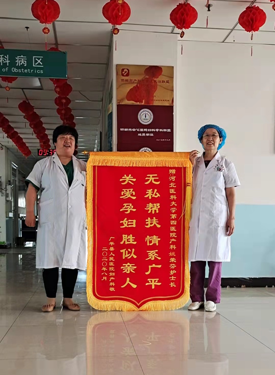 2019年8月到2021年8月,產科姚榮芬副主任護師連續兩年深入廣平縣人民醫院進行幫扶,協助開展了自由體位分娩、適度會陰保護技術等,使產婦在舒適中分娩。她通過示教、講座等形式對科室人員進行專業培訓,講解新生兒窒息復蘇知識、難產知識并進行技術操作培訓,傳授新生兒早期肌膚接觸、晚斷臍的新理念。她的工作和付出得到了很多產婦和家屬的認可,被贈送了錦旗。當地醫院領導對姚榮芬所作出的貢獻表示高度稱贊,以廣平縣人民醫院的名義向她贈送錦旗。