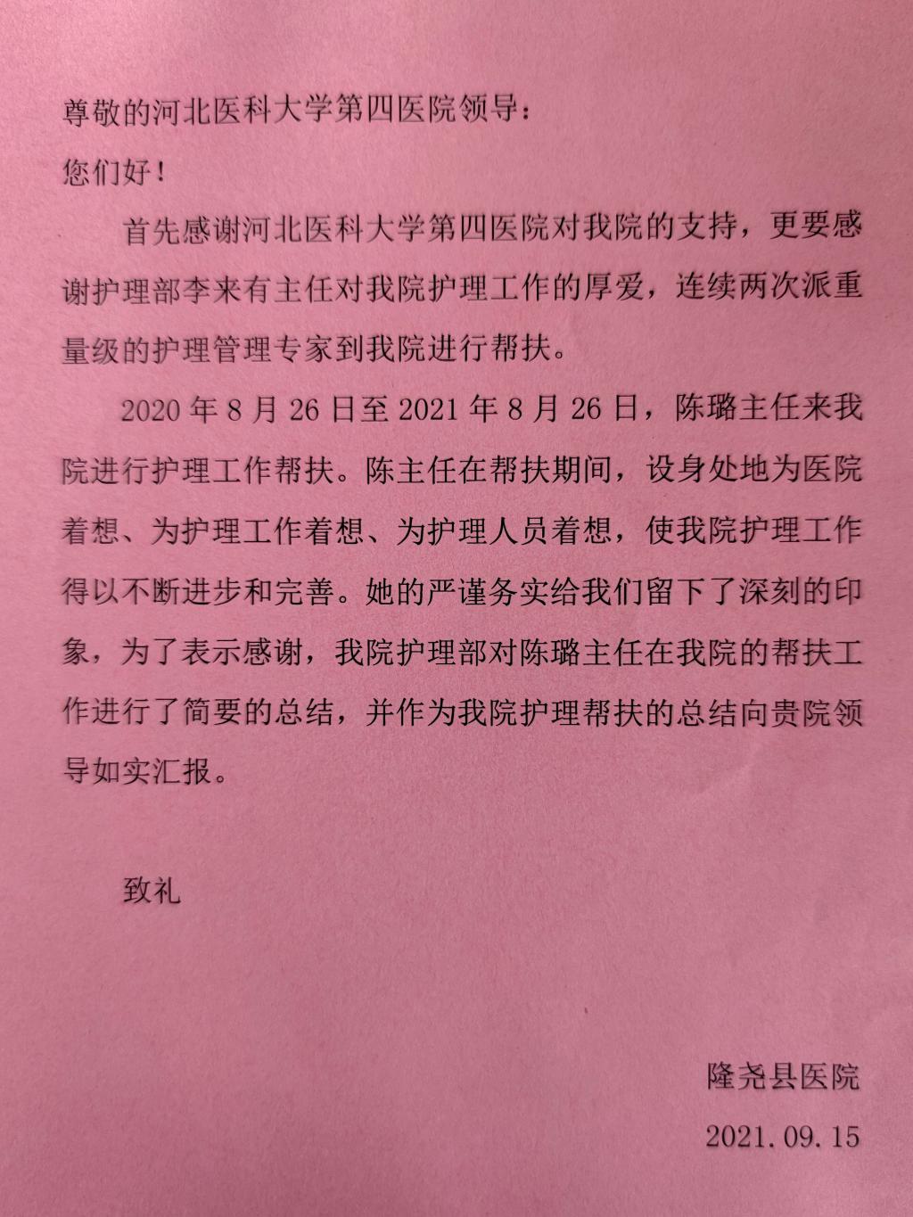 近日,隆堯縣醫院給我院發來感謝信,信中記錄了陳璐副主任工作期間的點點滴滴,字里行間表達了對我院護理部以及幫扶專家的誠摯謝意。
