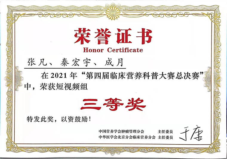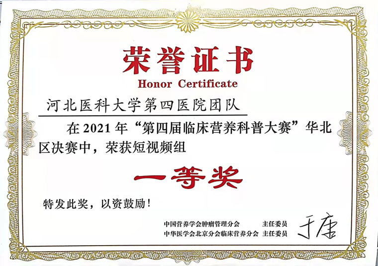 為展現臨床營養師的工作風采,科室成員積極參加、籌備多項營養賽事,喜獲佳績。在中國營養學會腫瘤營養管理分會主辦的“第四屆臨床營養科普大賽”中,臨床營養科《“熱愛”營養的她》科普視頻作品獲河北賽區一等獎、華北賽區一等獎、全國總決賽三等獎。科普作品《有超級防癌食物嗎》獲2021年度河北省健康科普作品征集大賽圖文類三等獎。為響應“全民營養周”及“5.11防治肥胖癥及其并發癥”的活動號召,科室舉辦減脂大賽,深入落實“健康中國”行動營養健康任務要求。