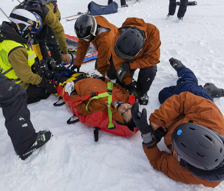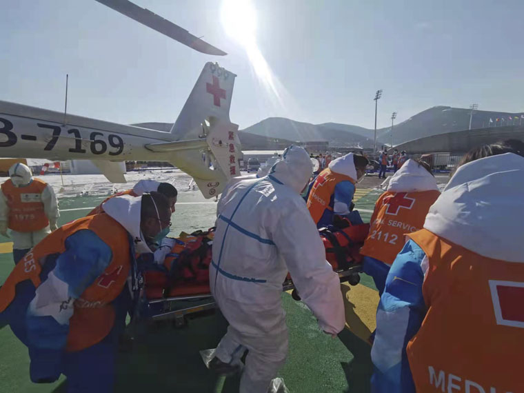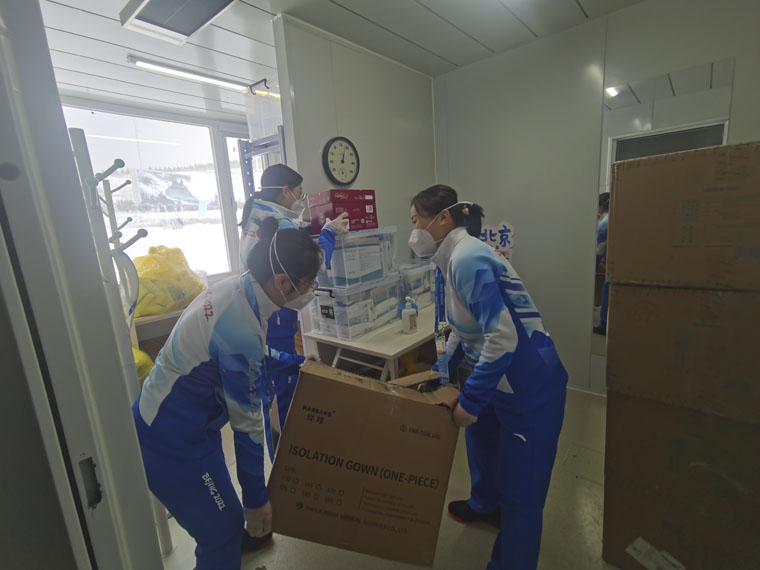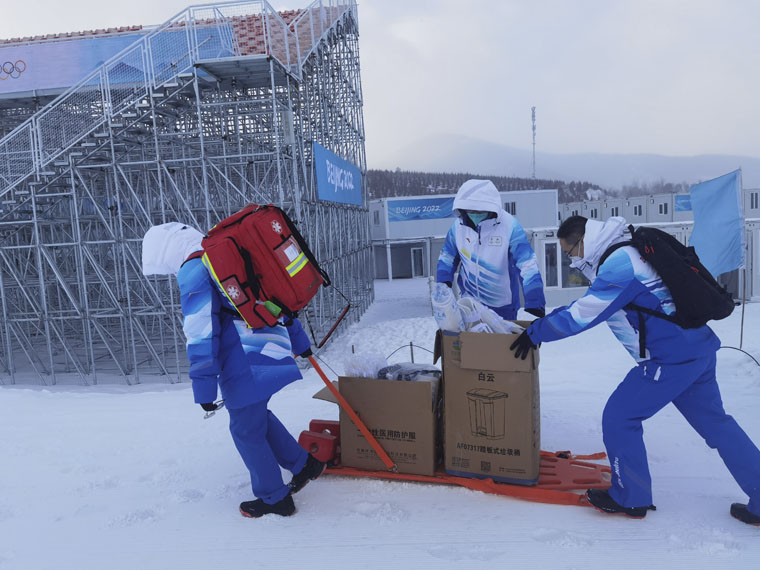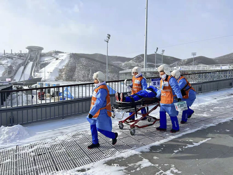 在冬季兩項運動員醫療站,我院冬奧醫療保障隊員分工合作,迅速開展醫療設備及防疫物資(包括急救藥物、急救擔架、醫用外固定支具、心電監護儀、呼吸機、電除顫儀、醫用消毒劑、醫用隔離衣及防護服、醫用防護面屏、醫用外科口罩、通訊手臺、視頻記錄儀等)的組裝、整理與搬運工作。大家嚴格遵守新冠疫情防控政策,按照醫療救治服務保障運行腳本,在運動員醫療站、觀眾醫療站、FOP1、2、3、4醫療站模擬進行了多場冬奧會倒計時階段的沖刺保障演練。