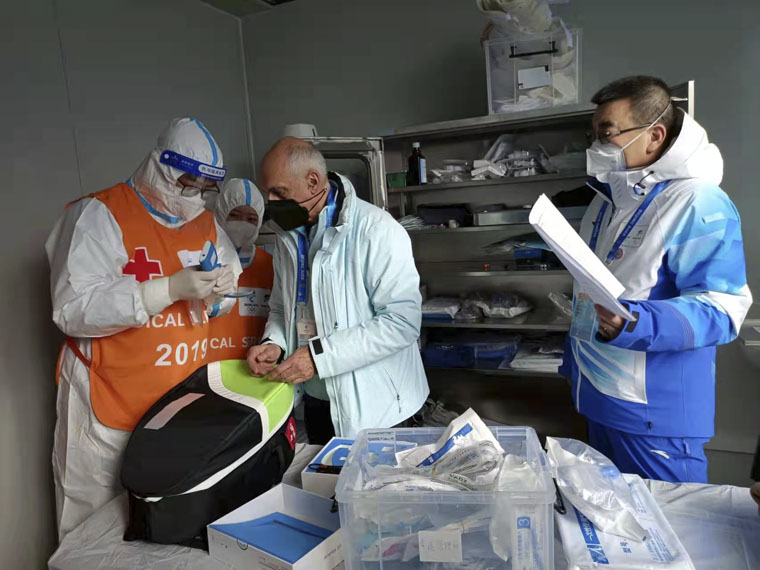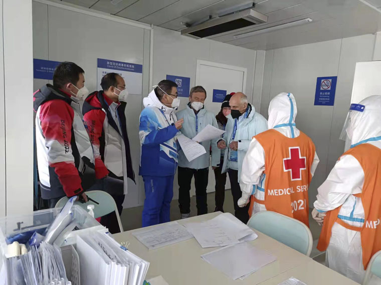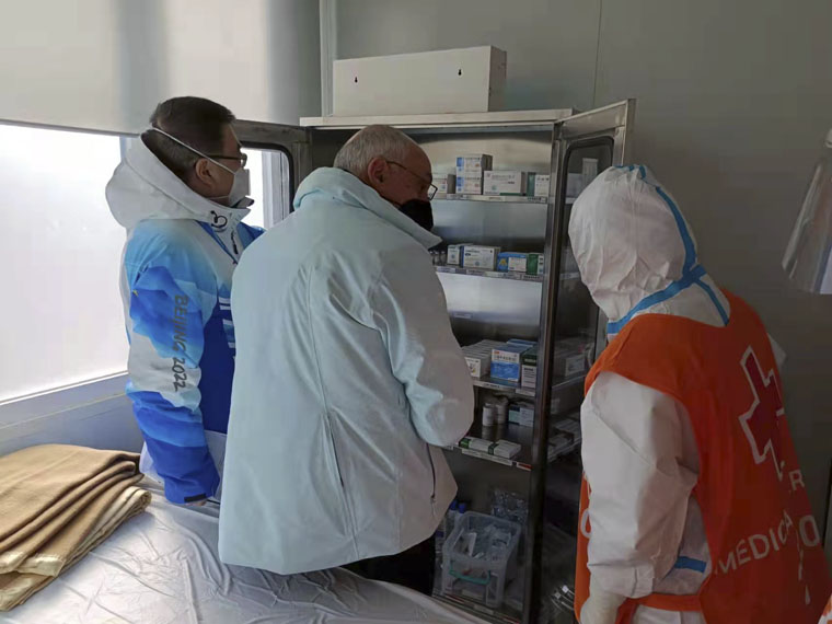 2月8日,國際奧委會醫學科學部醫療組主席沃爾夫崗·舍伯斯伯格先生和成員大衛·齊德曼先生實地考察了我院負責保障的國家冬季兩項中心運動員醫療站和FOP醫療站,對自動心肺按壓系統(LUCAS)、喉鏡設備、自動體外除顫器(AED)、危重癥搶救藥物、外傷急救轉運工作進行了專項指導,稱贊我院冬奧會醫療保障工作“細節之處見功夫”。