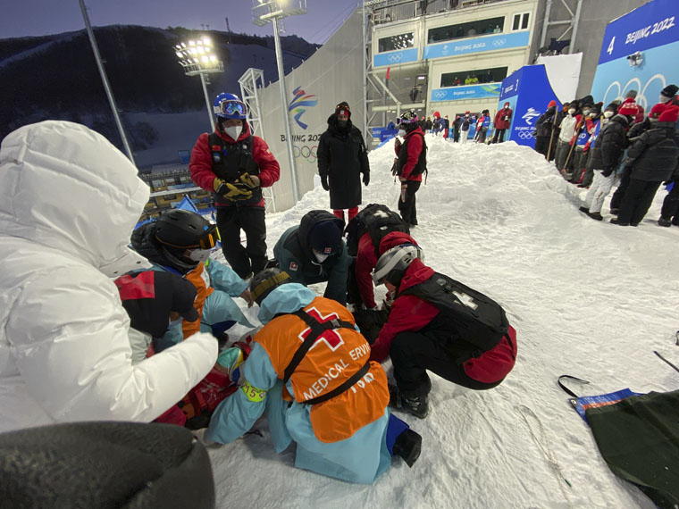 賽事正式開始,面對嚴寒和大風天氣,在賽道點位站立6-8小時之久,還要時刻緊繃精神、準備救援,對每一名隊員來說都是極大的挑戰。2月8日,在單板障礙追逐賽中,一名運動員經過波浪道飛起落地時失衡,程子安即刻背好急救包登上雪板準備,接到救援指令后第一時間抵達運動員身旁進行查體,并將其攙扶移出賽道,護送至終點。2月9日,在單板障礙追逐賽中,一名運動員在賽道摔倒,自行站起后走到賽道邊緣。李振華迅速趕到,運動員自訴右側膝關節處疼痛,難以完賽,經與國際救援隊員初步詢問查體后,診斷為右側膝關節外傷,李振華呼叫救援船予以緊急轉運至運動員醫療站,在支具固定后送上救護車轉運至定點醫院。此外,李振華還在賽期及時救治了一名被運動員撞倒的工作人員。截止2月15日,這支“夢之隊”共對21人進行救治,得到了國際雪聯和冬奧組委的一致好評。