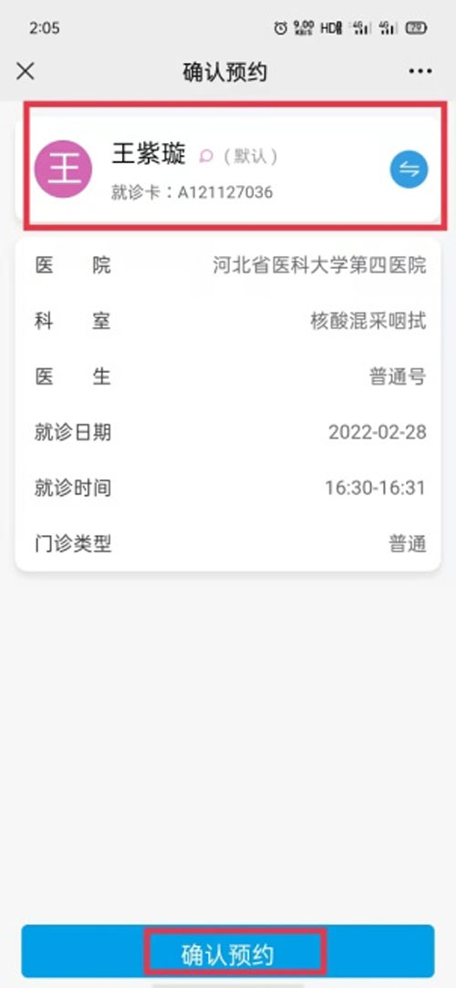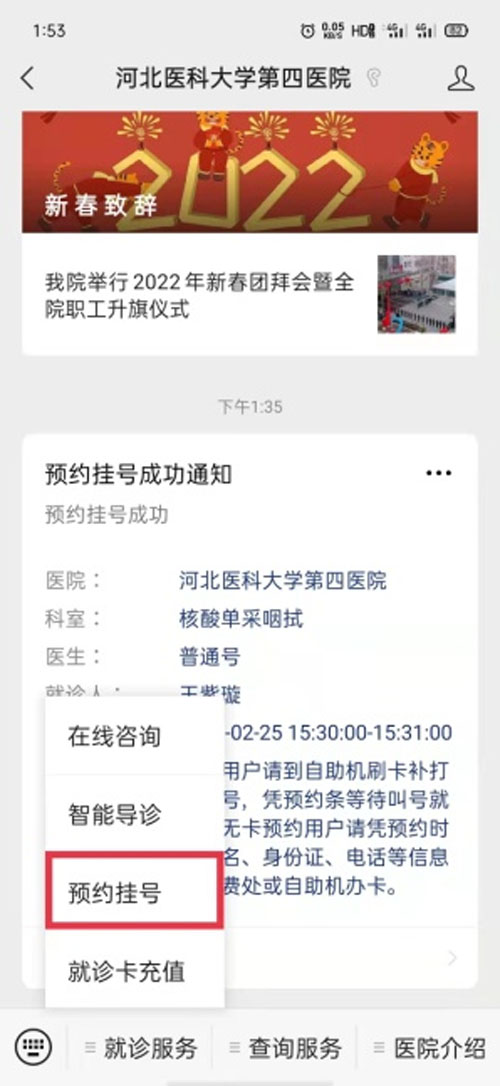就診服務→預約掛號→選擇科室→選擇時間和醫生→點擊預約→選擇時間段→選擇就診人→確定預約→跳轉到繳費列表中→確認支付→支付完成→查詢預約記錄→我的掛號中可查看到掛號信息。