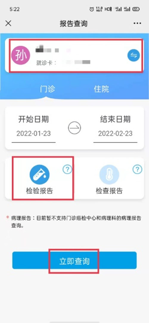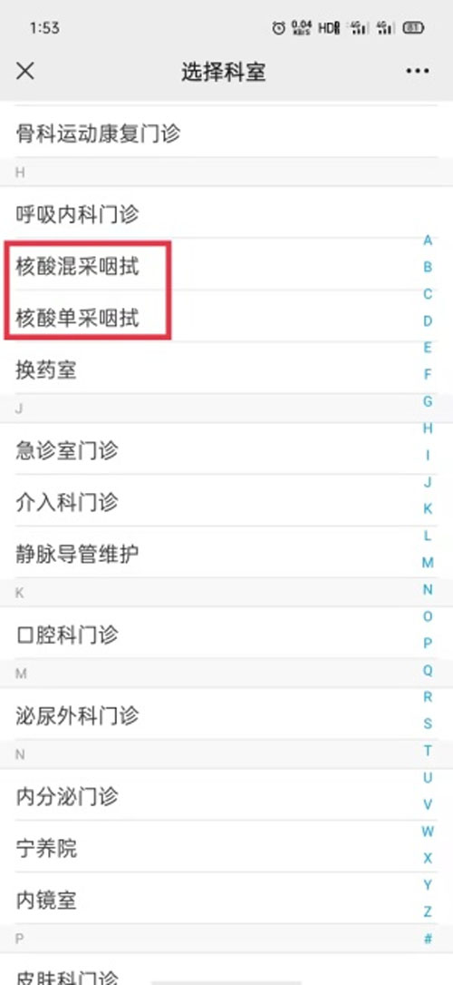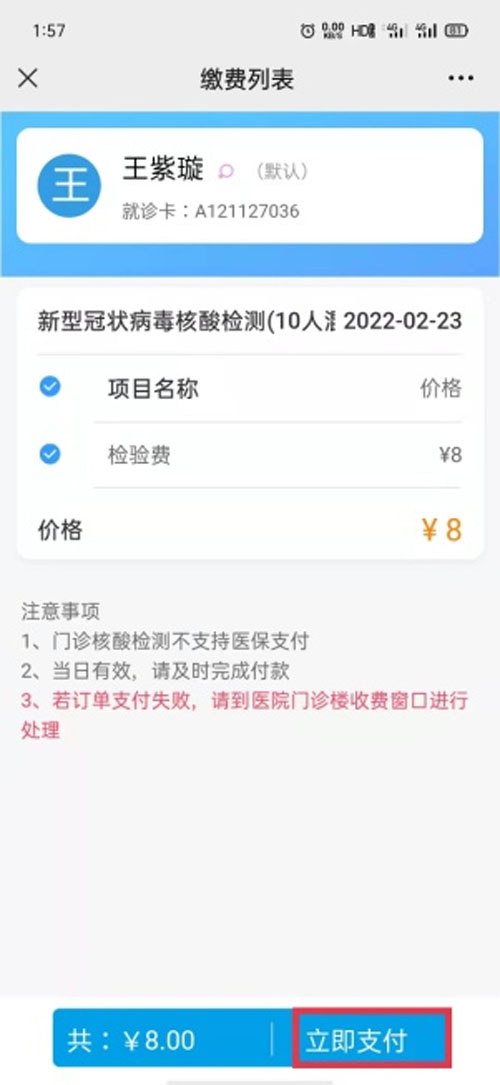 標本采集處手機出示 “電子健康卡二維碼”進行核酸檢測:查詢服務→電子健康卡→點擊就診人電子健康卡片→電子健康卡詳情。