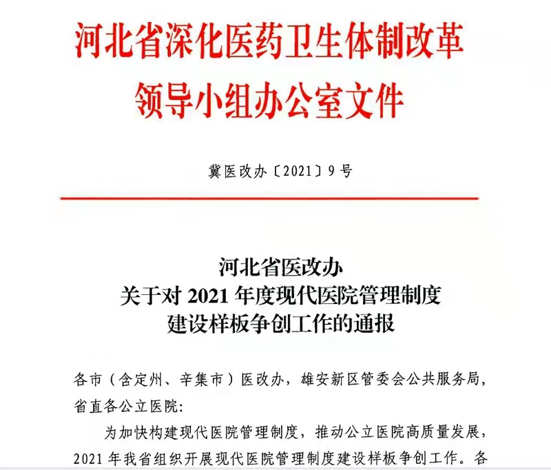 為加快構建現代醫院管理制度,推動公立醫院高質量發展,2021年河北省衛健委醫改處組織開展了“現代醫院管理制度建設樣板爭創”工作,共有27家省級現代醫院管理制度建設樣板候選單位參加,我院等6家醫院被評為“2021年度省級現代醫院管理制度建設樣板”醫院。