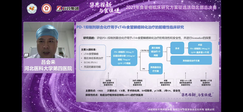 本次賽事分南、北兩大賽場,幾乎涵蓋全國所有省份,北部賽區涉及10余個省份,旨在搭建食管癌領域專家交流平臺,促進食管癌領域整體醫療水平的提高。在河北賽區、北部大區的比賽中,呂會來副主任均順利晉級。20211119日,北部總決賽在線上拉開帷幕,由中國醫學科學院腫瘤醫院李印教授、黃鏡教授及江蘇省人民醫院束永前教授擔任大會主席。來自中國醫學科學院腫瘤醫院、哈爾濱醫科大學附屬腫瘤醫院、空軍軍醫大學唐都醫院、重慶醫科大學附屬第二醫院、河南科技大學第一附屬醫院和我院的7名選手參加,均為上一輪各大區賽晉級選手。所有選手要求完成15分鐘的PPT演講,之后,來自國內20余家醫院的30多名腫瘤領域相關專家進行提問、點評、打分。