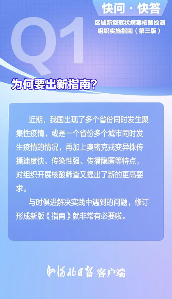近日,國家衛生健康委發布《區域新型冠狀病毒核酸檢測組織實施指南(第三版)》,強調核酸檢測應該目標明確、有的放矢,不能搞“一刀切”;明確推進“抗原篩查、核酸診斷”的監測模式……