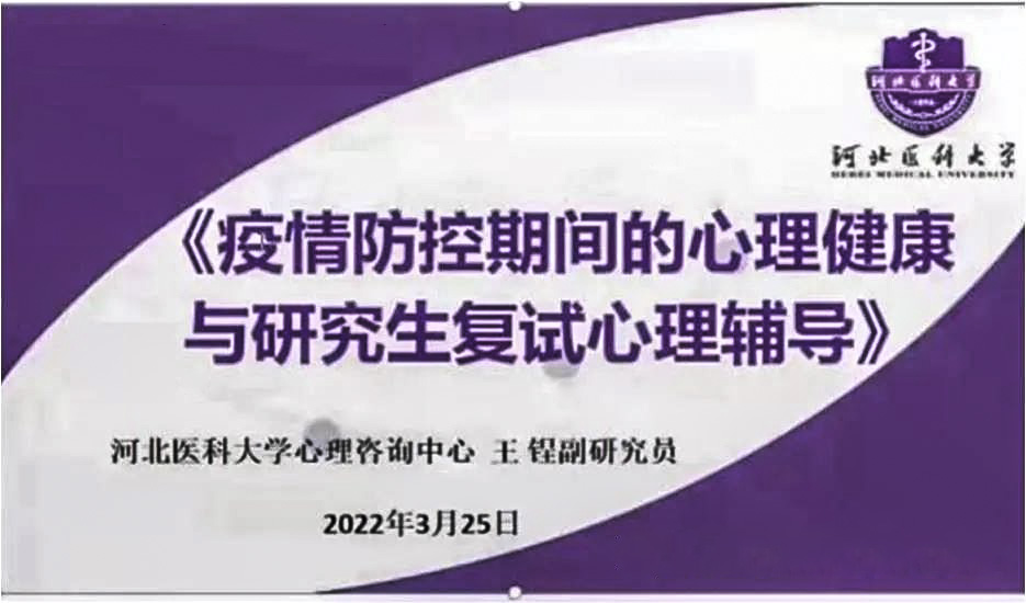 3月25日,為提高本科2018級護理和助產專業實習學生應對心理危機事件、緩解心理壓力的能力,幫助學生順利度過考研復試、求職備考階段,我院護理教學辦公室邀請河北醫科大學心理咨詢中心王锃主任,進行了“疫情防控期間的心理健康與研究生復試心理輔導”專題心理講座。本次講座以線上形式進行,護理教學辦公室班主任吳景梅、段紅霞及本科2018級全體實習學生參加。