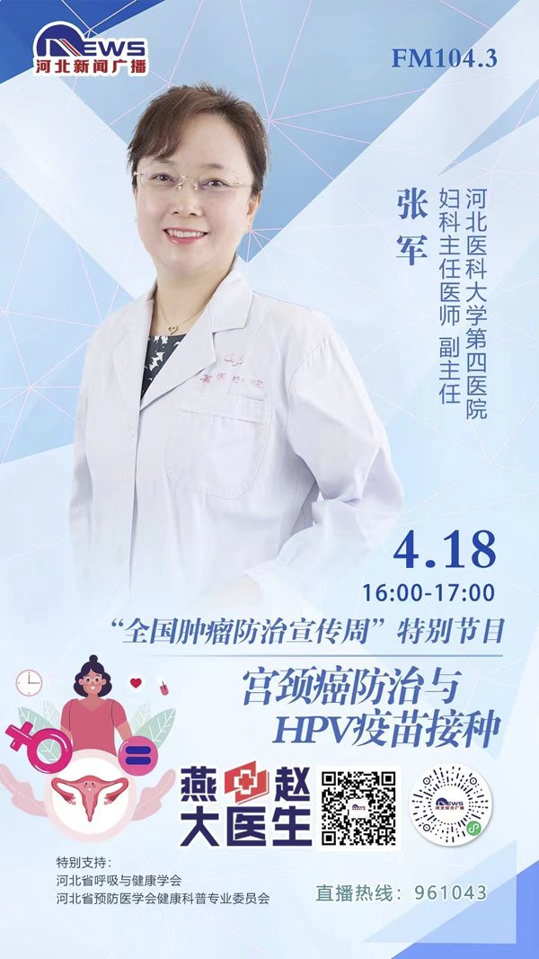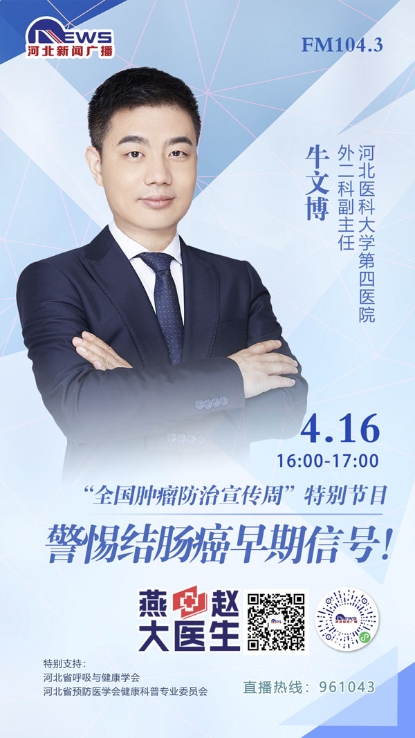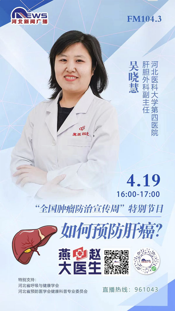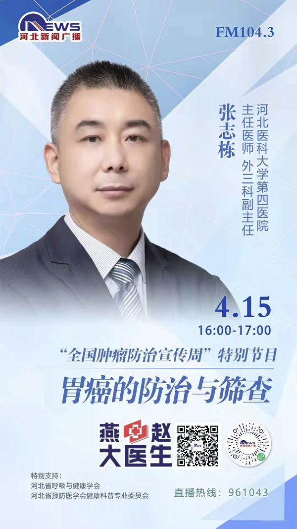 在第28個全國腫瘤防治宣傳周到來之際,我院外三科副主任張志棟、外二科副主任牛文博、婦科副主任張軍、肝膽外科副主任吳曉慧,分別在4月15號、16號、18號、19號下午4點-5點,做客河北新聞廣播“燕趙大醫生”直播間,幫助廣大群眾提高癌癥防控意識,為患者及家屬答疑解惑,享受高質量生活,促進形成全民防癌抗癌的良好氛圍。歡迎大家屆時關注。